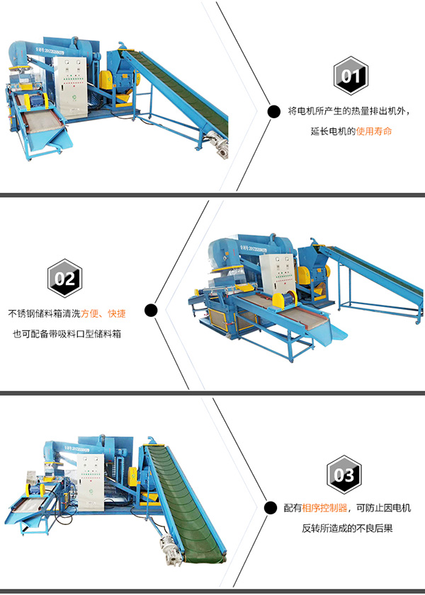 銅米機(jī)也叫做銅線粉碎機(jī),銅米機(jī)設(shè)備適用于插座線、單銅硬線、花線、護(hù)套軟線、汽車摩托車電路線、鋁塑線、地埋線、接電線、各種電器線、通訊電話線等。因剝線機(jī)不適用的各種雜料電纜線和電線的粉碎分離回收。這些廢線回收來的規(guī)格大小長短不齊,不適宜用剝線機(jī)來處理,銅米機(jī)處理這些線處理銅鋁材質(zhì)的分類,像長短粗細(xì)不同的可以同時用銅米機(jī)來破碎,分選率可達(dá)百分之九十八。